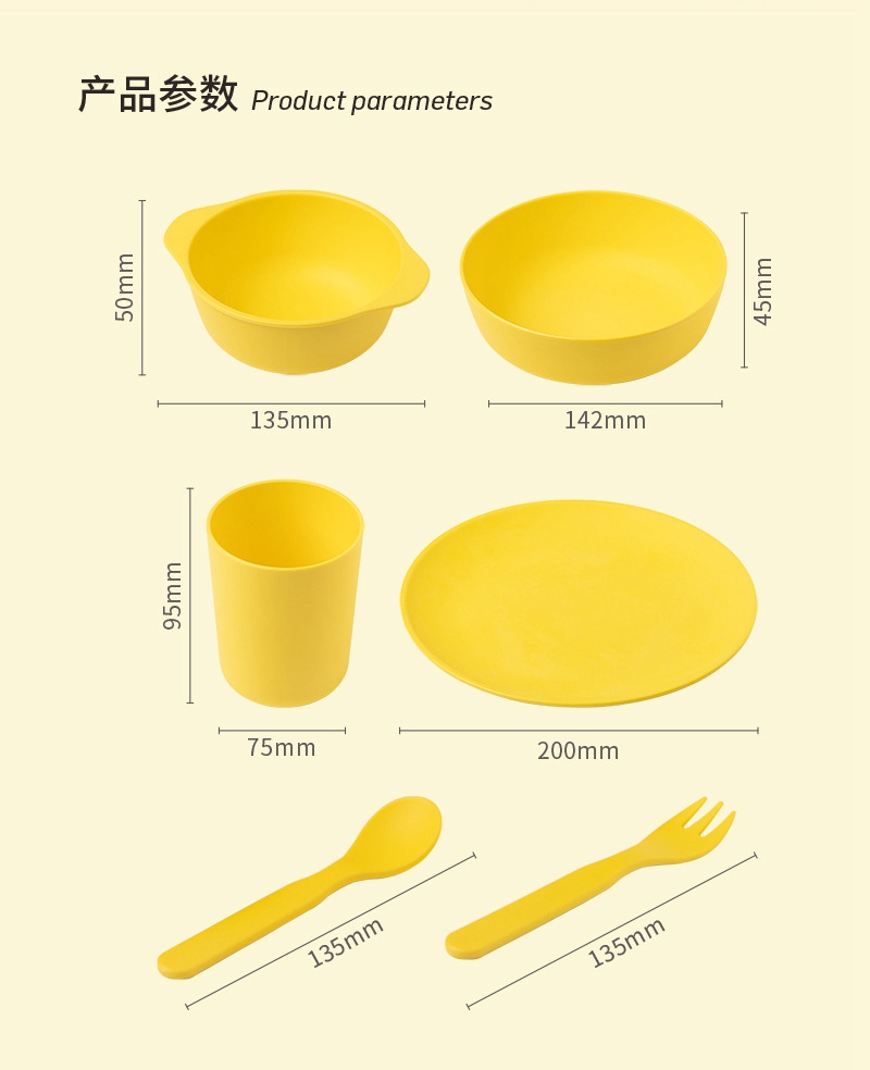 Plate: D200*H18 mm Round Bowl: D142*H45 mm Cup: D75*H95 mm Cutlery: L135 mm |